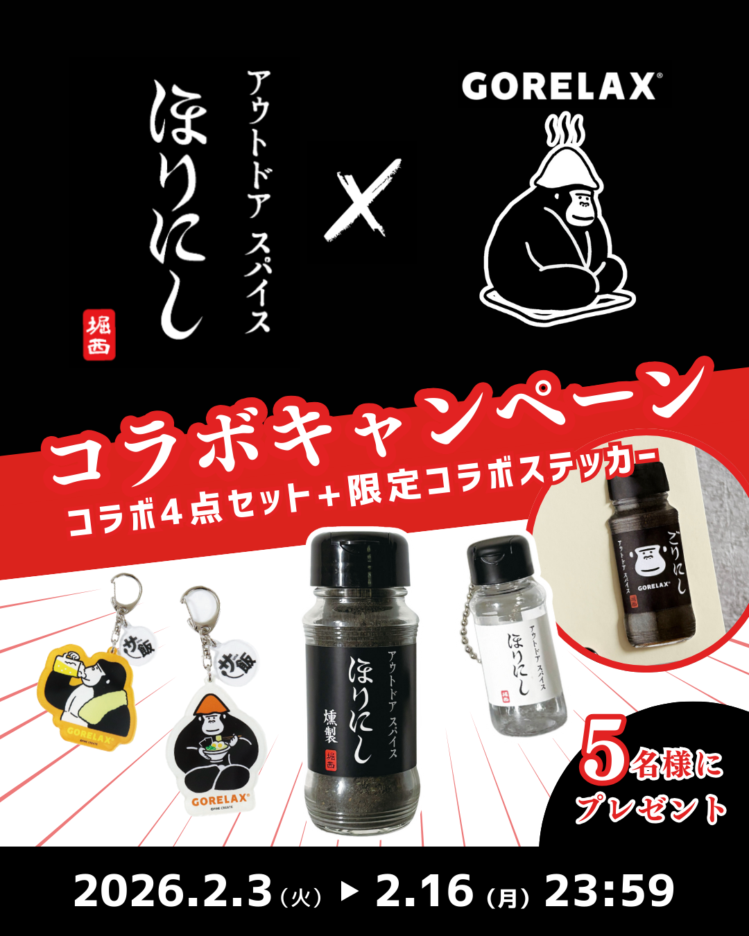 株式会社パイン・クリエイトが展開するととのい系サウナブランド「ごリラックス」は、和歌山県のアウトドアショップ発の万能スパイスとして有名な「アウトドアスパイス ほりにし」とのSNSコラボ企画を、2月3日(火)からスタートします。