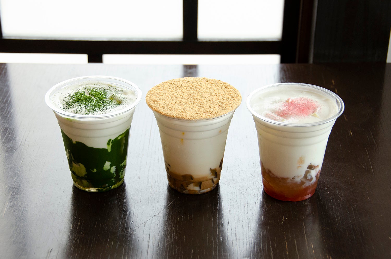 “きなこととろり”ならではの、のどごしなめらかなとろりわらび餅とミルクのやさしいコクが溶け合う新食感ドリンク「とろりわらび餅ラテ」の味わいは全部で三種類。ミヤギシロメ大豆を使用した濃厚なきな粉の風味を堪能できる“きなこととろり”一押しの「深みきな粉」をはじめに、オリジナルブレンドの宇治抹茶を使用した「宇治抹茶」、春季限定の桜香る見た目にも可愛らしい「さくら」をご用意しております。