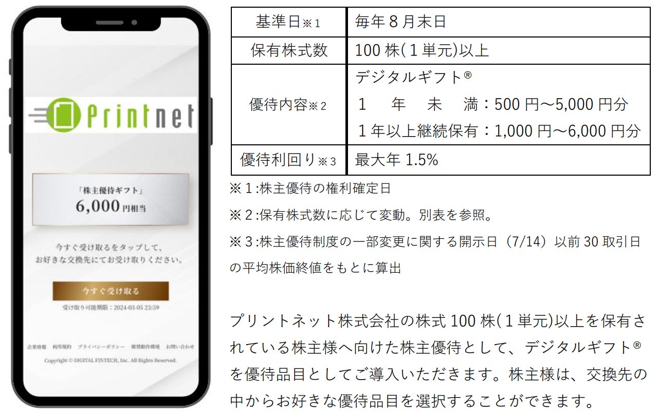プリントネット株式会社(代表取締役会長兼社長:小田原 洋一、東証スタンダード市場:証券コード7805)において、株式会社デジタルプラス(代表取締役社長:菊池 誠晃、本社:東京都渋谷区、東証グロース市場:証券コード3691)の子会社である、株式会社デジタルフィンテック(代表取締役社長:菊池 誠晃、本社:北海道札幌市)が運営する「デジタルギフト®」を株主優待としてご活用いただくことになりました。