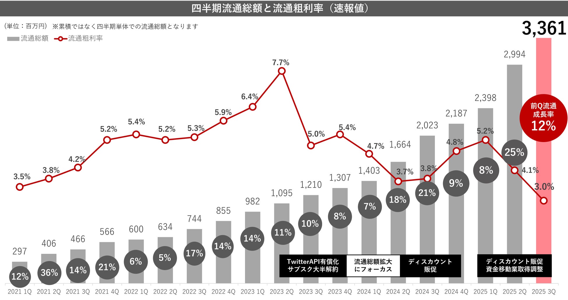 2025年9月期第3四半期においては前四半期対比112%、流通総額約34億円へ到達いたしました。流通総額1,000億達成に向けて、「3万円以下のto C現金支払い」を、①広告領域 ②人材領域 ③金融領域の3軸にて網羅を目指してまいります。各領域における取り組みを強化し、2027年9月期に掲げている流通総額1,000億円を達成することで、圧倒的低手数料を実現し、より多くの企業様にご利用いただけるよう、更に邁進してまいります。
