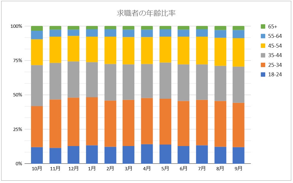 年齢推移は、24~34歳、35~44歳の層が最も多く、それぞれ約30%前後の割合を占め続けており、44歳以下の働きざかり世代が約70%の割合を占めています。