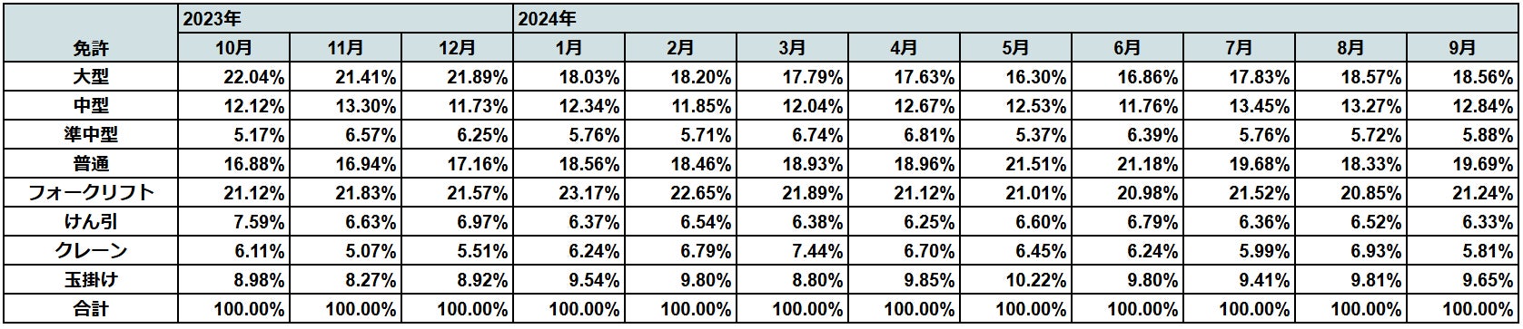 求人応募者の取得免許の推移に関しては、「大型」「普通」「フォークリフト」が最も多く、それぞれ約20%前後の割合を占め続けています。(※複数免許保持者あり)
