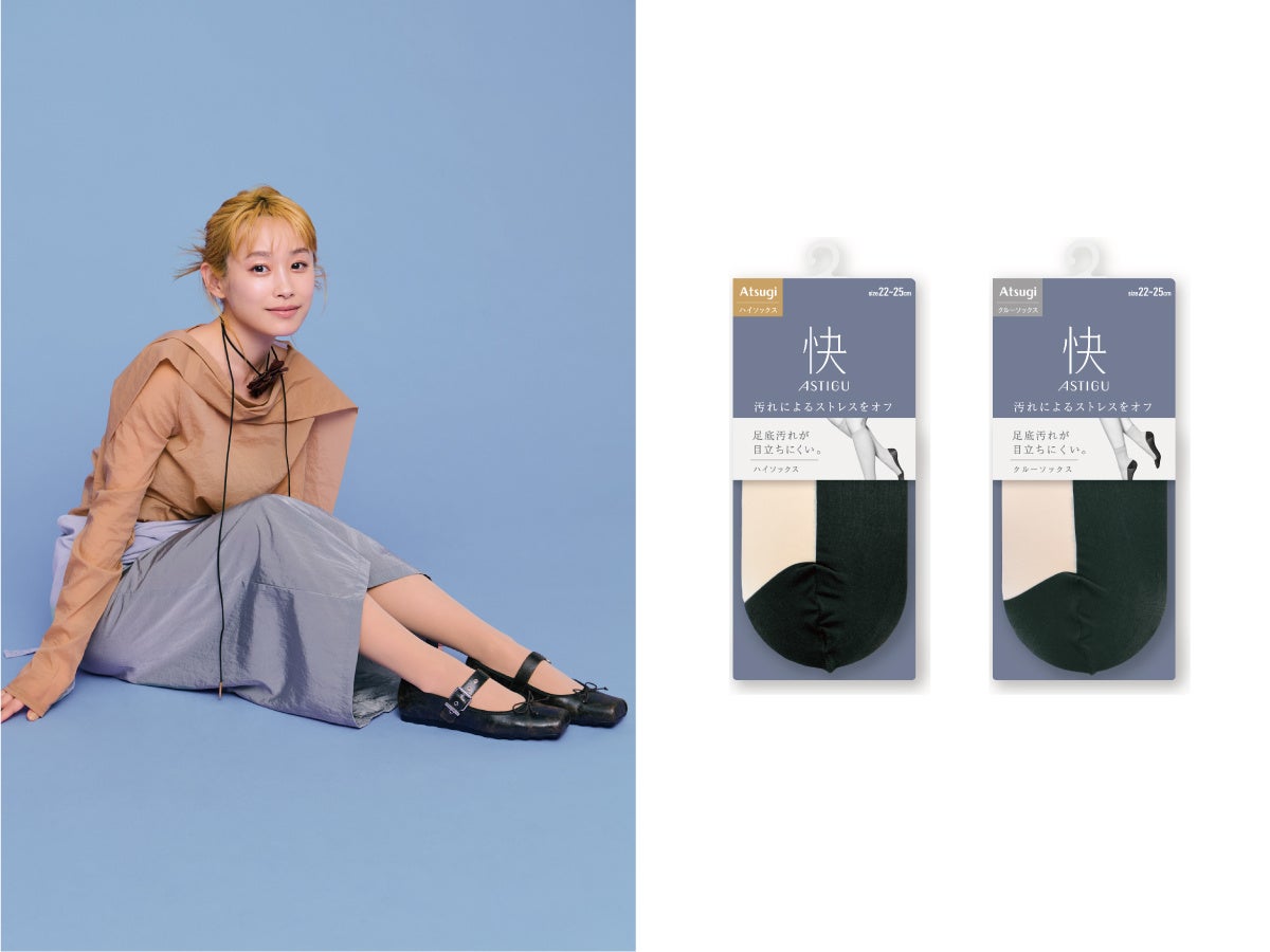 2025年秋冬シーズンからは更にソックスをラインアップに加えます。アスティーグソックスはコーディネートのポイントになるカラーや、ストッキングのように履けるカラーを展開。その日のファッションや欲しい機能で選べるレッグウェアの幅がさらに広がります。