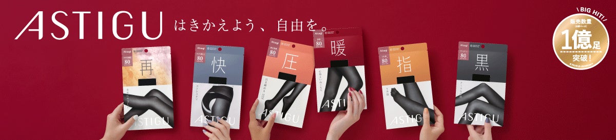 アスティーグのブランドコンセプト「はきかえよう、自由を。」には、その人本来の美しさを楽しんでほしいという想いを込めています。その日はきたいものを気分やファッションに合わせて選んでいただけるよう、商品の機能や特徴を漢字一文字で分かりやすく表現しています。 2025 年春夏シーズンからはインナーウェアが、2025年秋冬シーズンからはソックスがラインアップに加わり、レッグウェアとインナーウェアをトータルでご提案いたします。