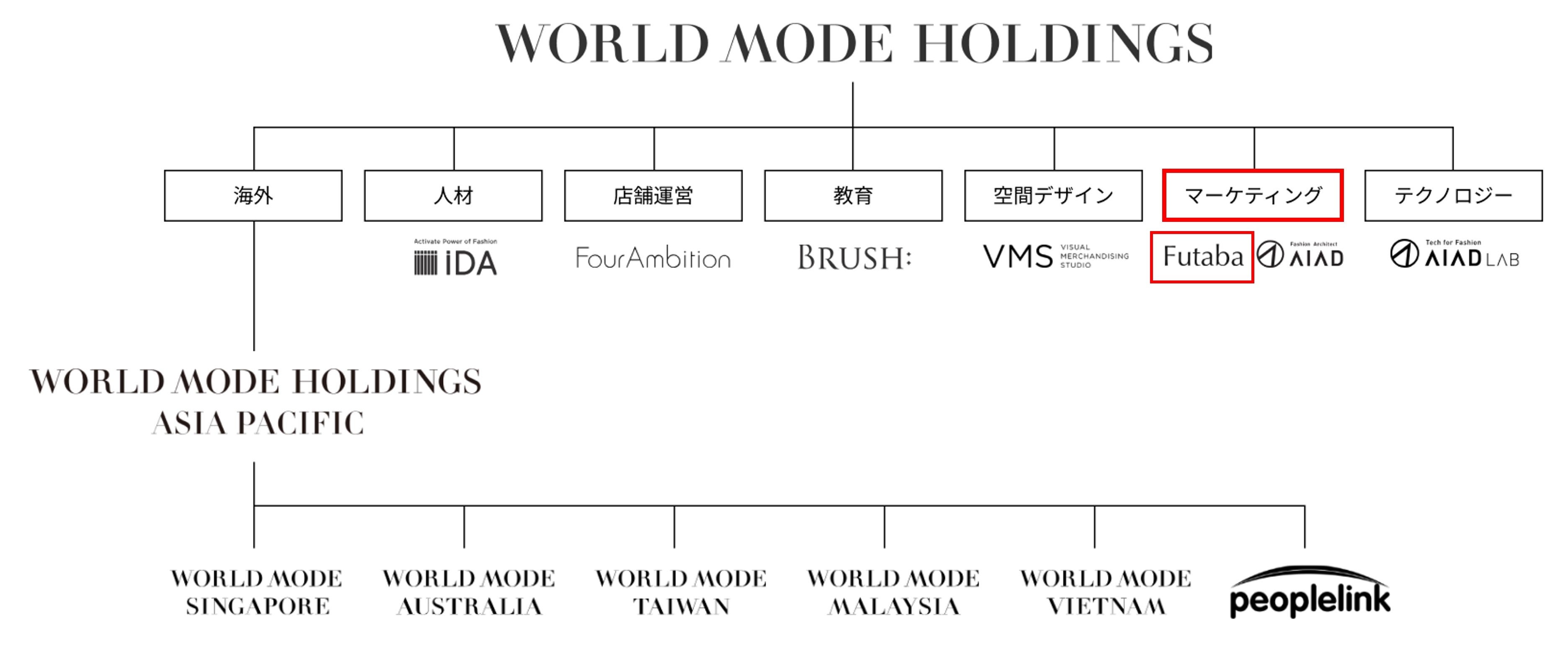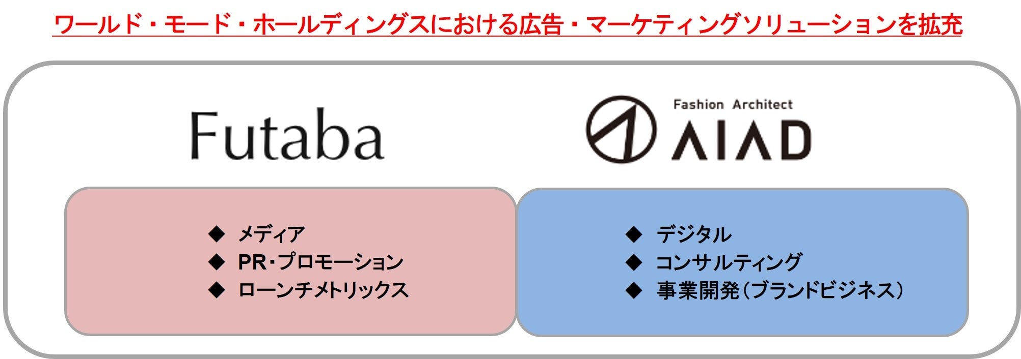 ワールド・モード・ホールディングスはファッション・ビューティ業界の異なる専門領域(人材サービス、教育、店舗運営代行、空間デザイン、広告・マーケティング、テクノロジー)に従事する6事業会社と海外5カ国に拠点を有するグループ会社であり、グループの総合力を生かしたソリューションを国内外で提供しています。業界および顧客の課題に対しより効果的なソリューション提供を可能とする体制強化に努める中で、広告・マーケティング領域のサービス拡充を図ることを目的に、広告代理店である双葉通信社をグループ傘下に迎え入れる運びとなりました。