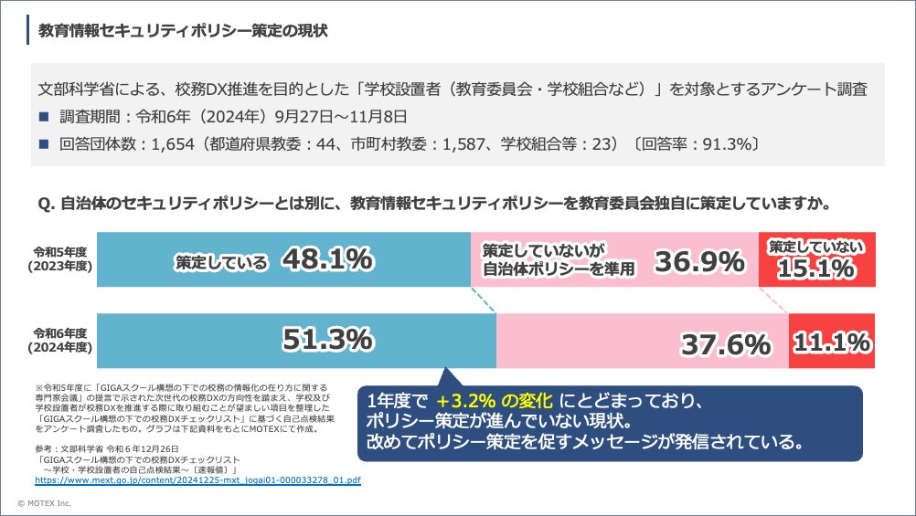 エムオーテックス株式会社(本社:大阪市淀川区、代表取締役社長:徳毛 博幸、以下MOTEX)は、セキュリティコンサルティングパッケージ「ガイドライン対応サポートアカデミー」に3つ目となる新たなメニューを追加し、教育機関(教育委員会・公立学校など)のセキュリティ課題解決を支援する取り組みを開始することを発表します。