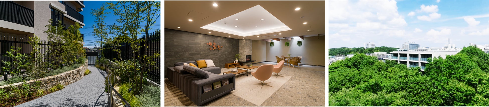 雑木林であった敷地内の緑豊かな自然林を「サステナブルガーデン」として保全・再整備。枯れかけた桜の大樹なども再生し、地域の貴重な資産として未来に継承。