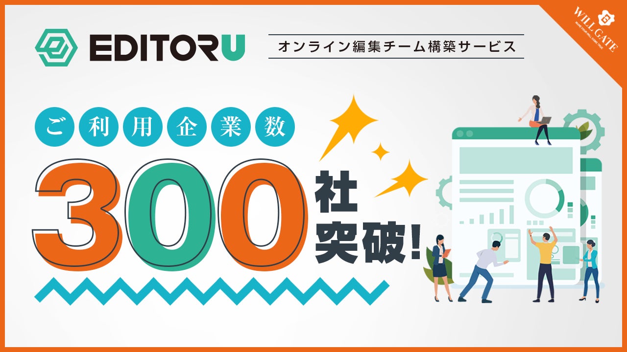株式会社ウィルゲート(本社:東京都港区、代表取締役:小島 梨揮、以下 ウィルゲート)が運営するオンライン編集チーム構築サービス「エディトル」は、利用企業数が300社を突破したことをお知らせいたします。また、利用企業数300社突破を記念して、初期費用を30%OFFでご利用いただけるキャンペーンを2月15日(水)までの期間限定で実施いたします。