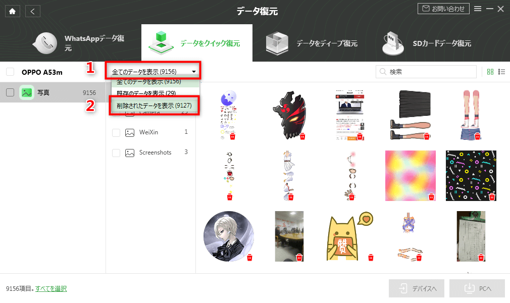 Step 6.復元したい写真を選択し、「デバイスへ」または「PCへ」をクリックします。それで、アンドロイドから削除した写真が復元されました。