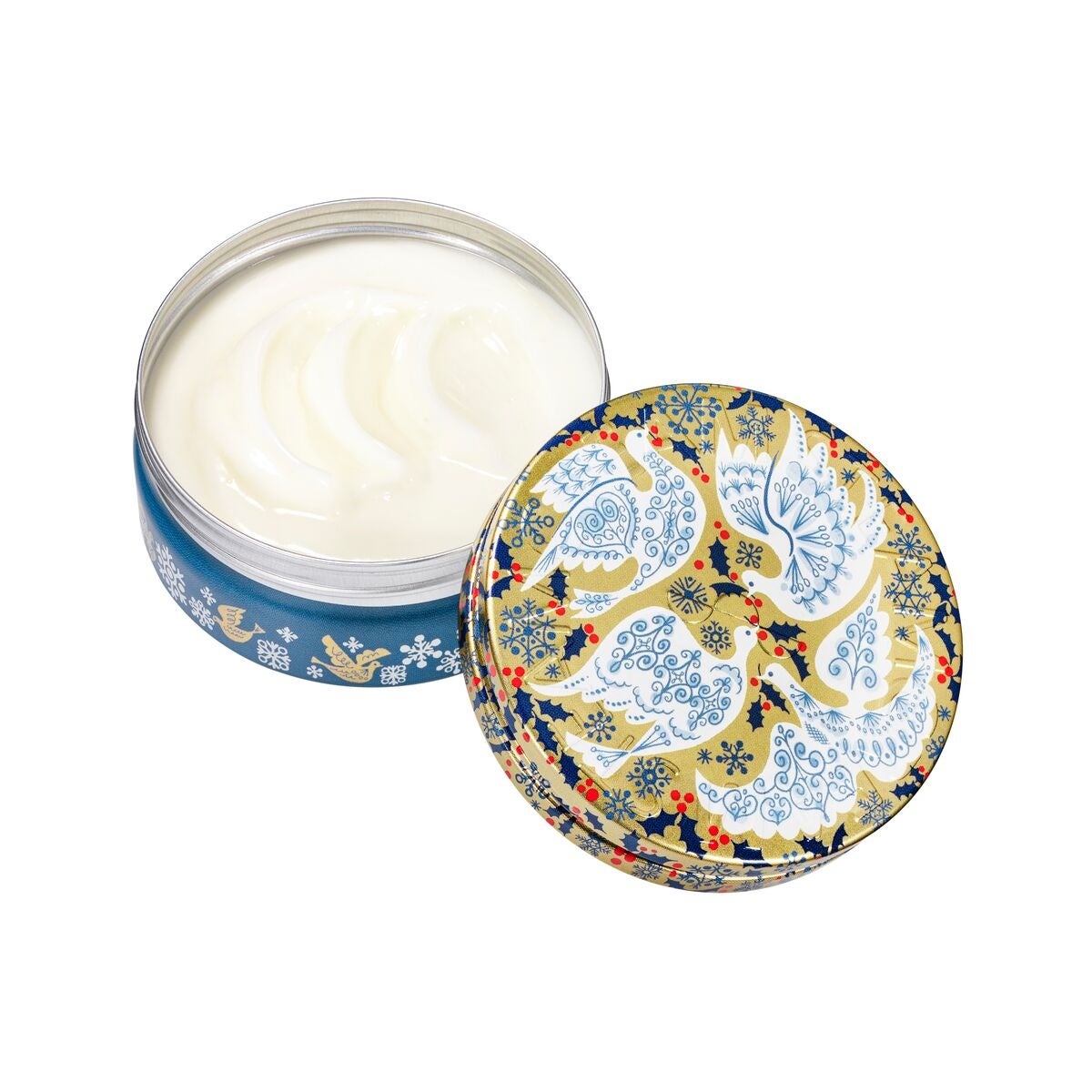 「PEACE」をテーマにしたデザインは、平和の象徴である美しい鳩が冬の空を舞う姿を描きました。背景のゴールドカラーに、落ち着いたやさしい色のブルーが重なることで、平和で穏やかなクリスマスの時を表現。よく見ると赤い実のなかに隠れハートが潜んでいます!本体側面には「PEACE」、底面にはペアとなる「LOVE」の文字が入っています。