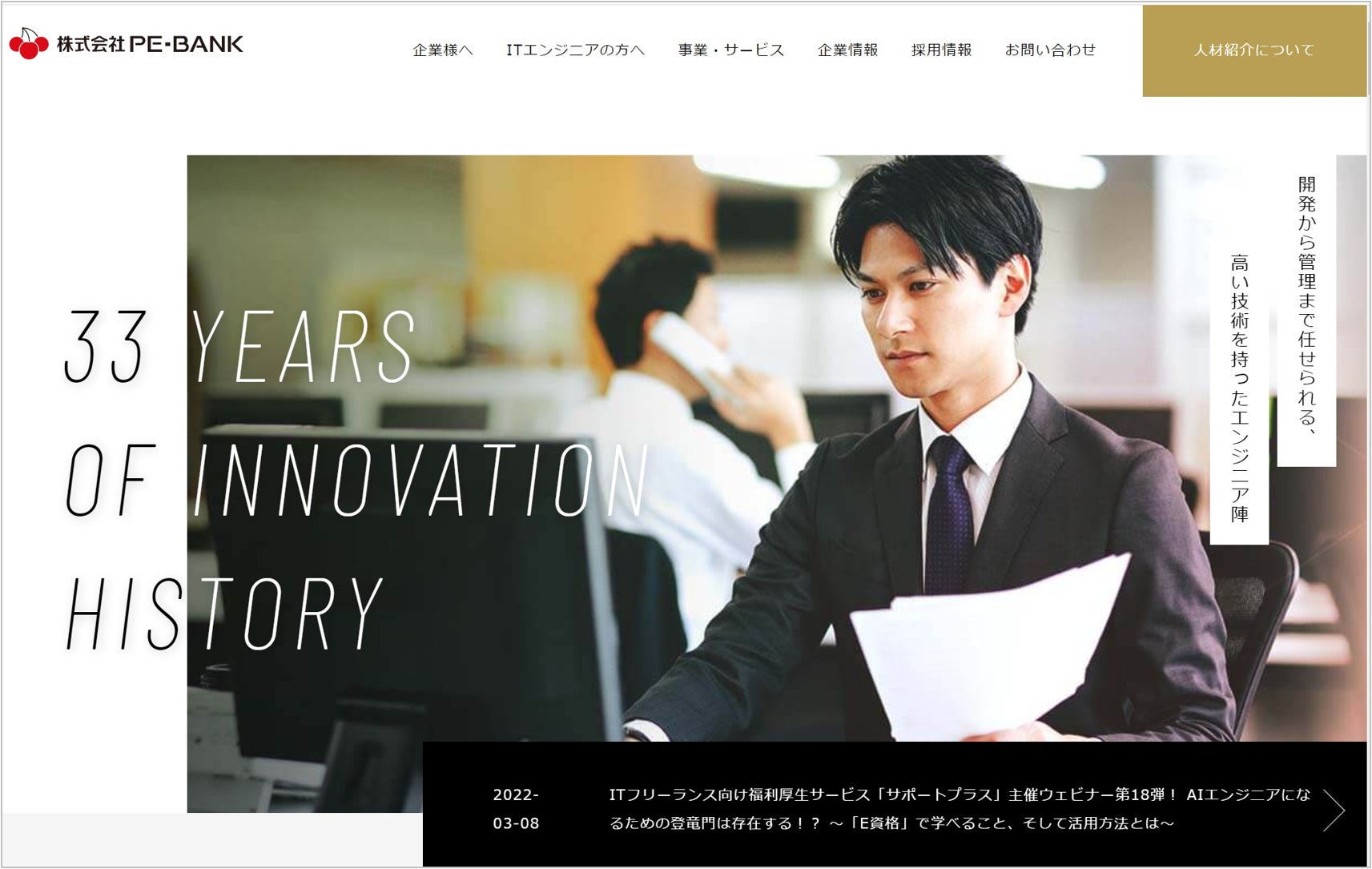 ITエンジニアと、IT人材を求める企業をつなぐ株式会社PE-BANK(東京都港区/代表取締役・髙田 幹也)は、2022年3月22日(火)よりコーポレートサイト(https://pe-bank.co.jp/)を全面リニューアルいたしました。