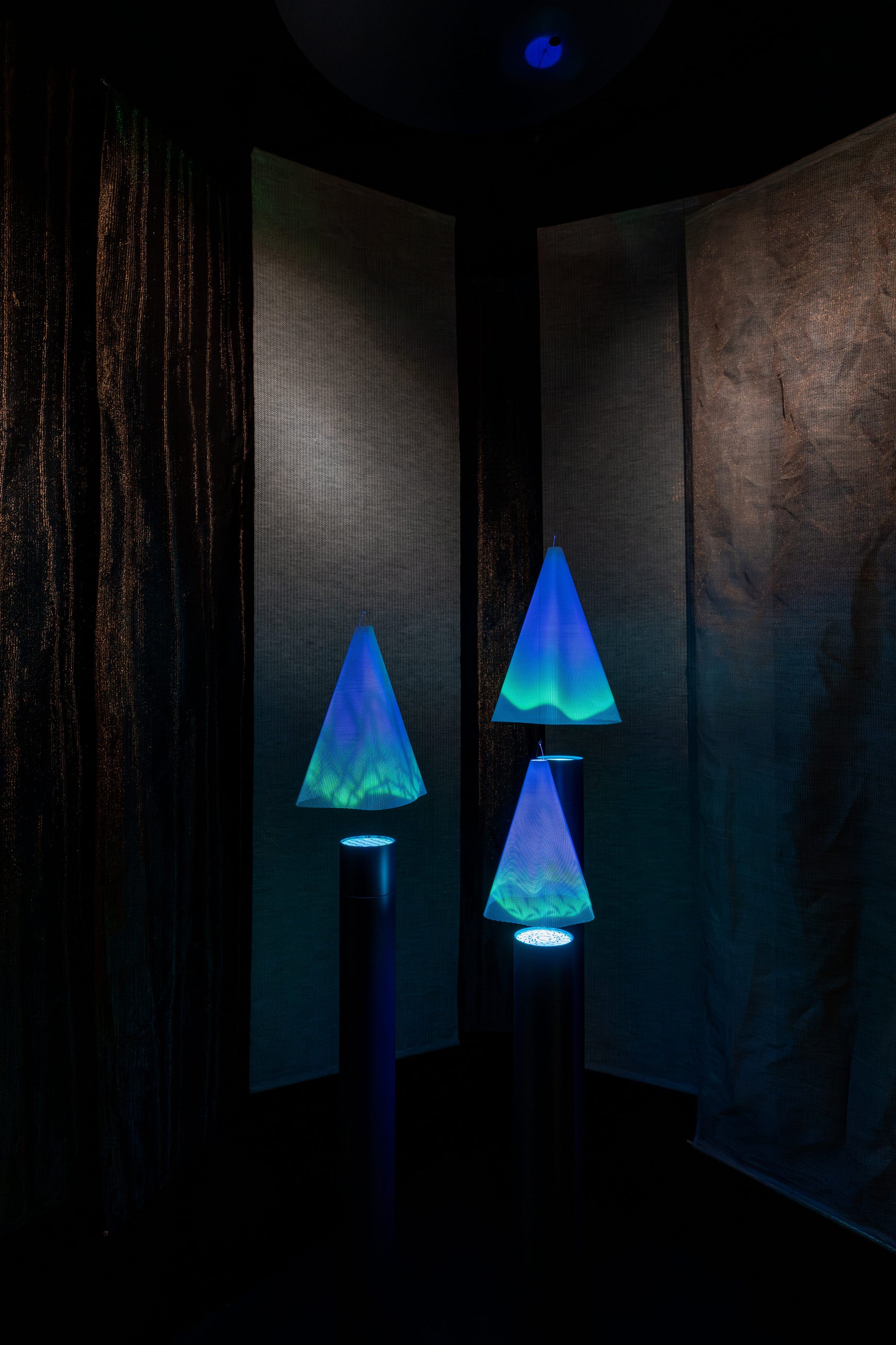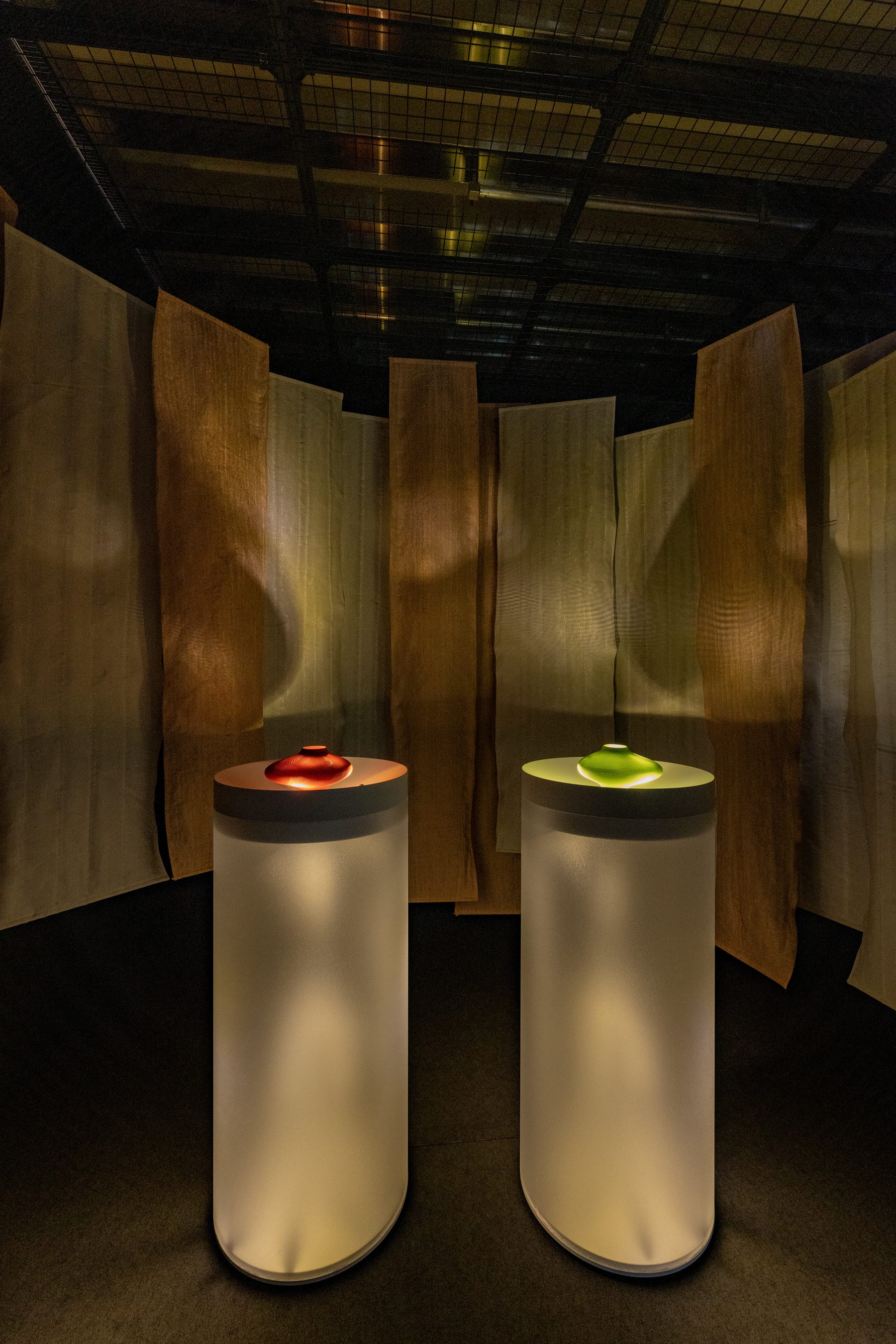 本展では複数のオブジェクトとそれらを取り巻く光や風、動きなどを通して生まれる、五感を刺激するKehai(気配)を、森の中を探求するように空間内を巡りながら体感いただけます。テキスタイルが描き出す軽快な揺らぎや、独特な表情をもつオブジェを光が通り抜けることで現れる陰影など、様々な素材が組み合わされ、光や風、訪れる人に出会うことで、その一瞬しか現れない表情を見せます。クルマの中に留まらず、LEXUSと関わるどのような時間をも、日々の複雑な思考から解放され、素に戻るような心豊かな時間にしたい、というデザイナーの想いでデザインされたアートインスタレーションの中を思い思いに巡り、様々な気配を感じ取りながら、ご自身のパーソナルな感性に響き合う発見をしていただけます。