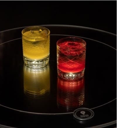 仄かに輝くグラスを使ったオリジナルドリンクでは、手元で光が変わりゆく様をお楽しみいただけます。光るグラスは、LEXUS車にも採用されている豊田合成株式会社の磁界共振式ワイヤレス給電を使っています。
