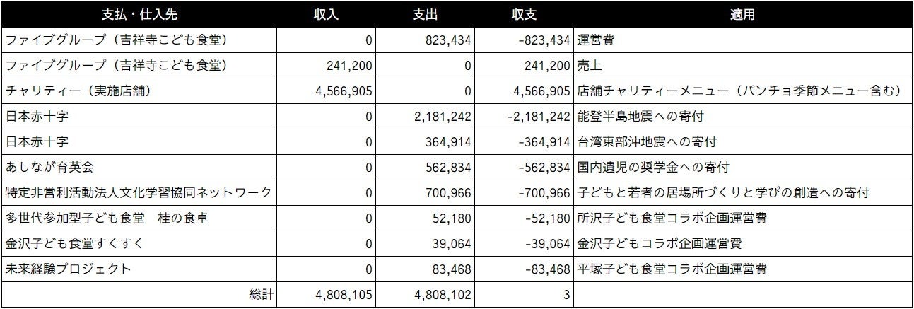「"楽しい"でつながる世界をつくる」飲食企業である株式会社ファイブグループ(本社:東京都武蔵野市、代表取締役社長:坂本憲史、以下 ファイブグループ)は、運営する各飲食店にて「チャリティーメニュー」を設置し、これを原資として、お客様と共に地域への貢献活動を実施しています。2023年はチャリティーメニューを通じて450万円を超える活動へのご支援をいただき、子ども食堂活動の他、江ノ島でのビーチクリーン、各種寄付も含め、1年間で合計20回の地域貢献活動を実施することができました。