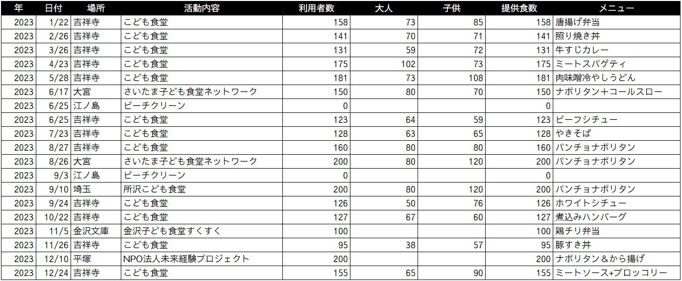 2023年のこども食堂開催実績は、吉祥寺の自社店舗11回、さいたま市、横浜市、所沢市でNPOなどとの共催7回の計18回、利用者総数は2550人です。
