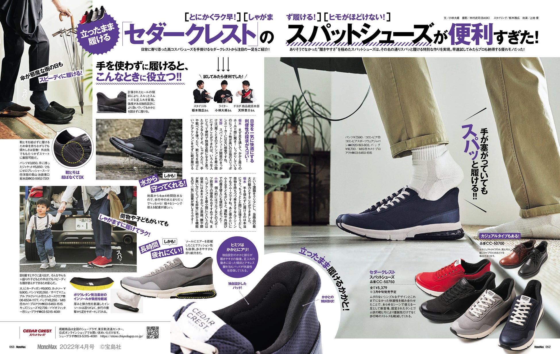 「セダークレスト」から、手を使わずに、しゃがまず履ける「スパットシューズ」が新発売。モノ・トレンド雑誌「MonoMax」でも紹介中。