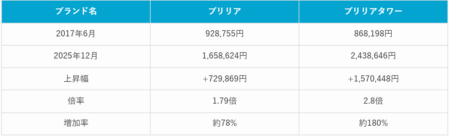 2017年6月から2025年12月までの価格推移を分析すると、ブリリアシリーズは顕著な上昇を見せています。