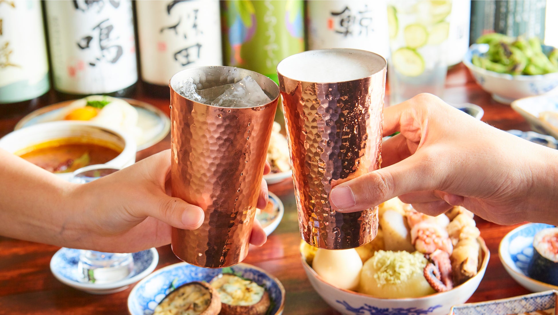 お店の内外装は古民家風にウッド調の暖かみのあるデザインに統一。提供するお料理は明治・大正時代の和柄模様のお皿にて提供いたします。さらに、飲み物は銅製グラスと薄張りグラスを採用。銅製グラスは、熱伝導の良さから冷たいお酒をより冷たく感じさせることにより、お飲み物をさらにおいしくお楽しみ頂けます。薄張りグラスは職人の卓越した技術で作られた極限まで薄く作られた飲み口が、飲み物本来の香りや舌触りを最大限に引き立ててくれます。