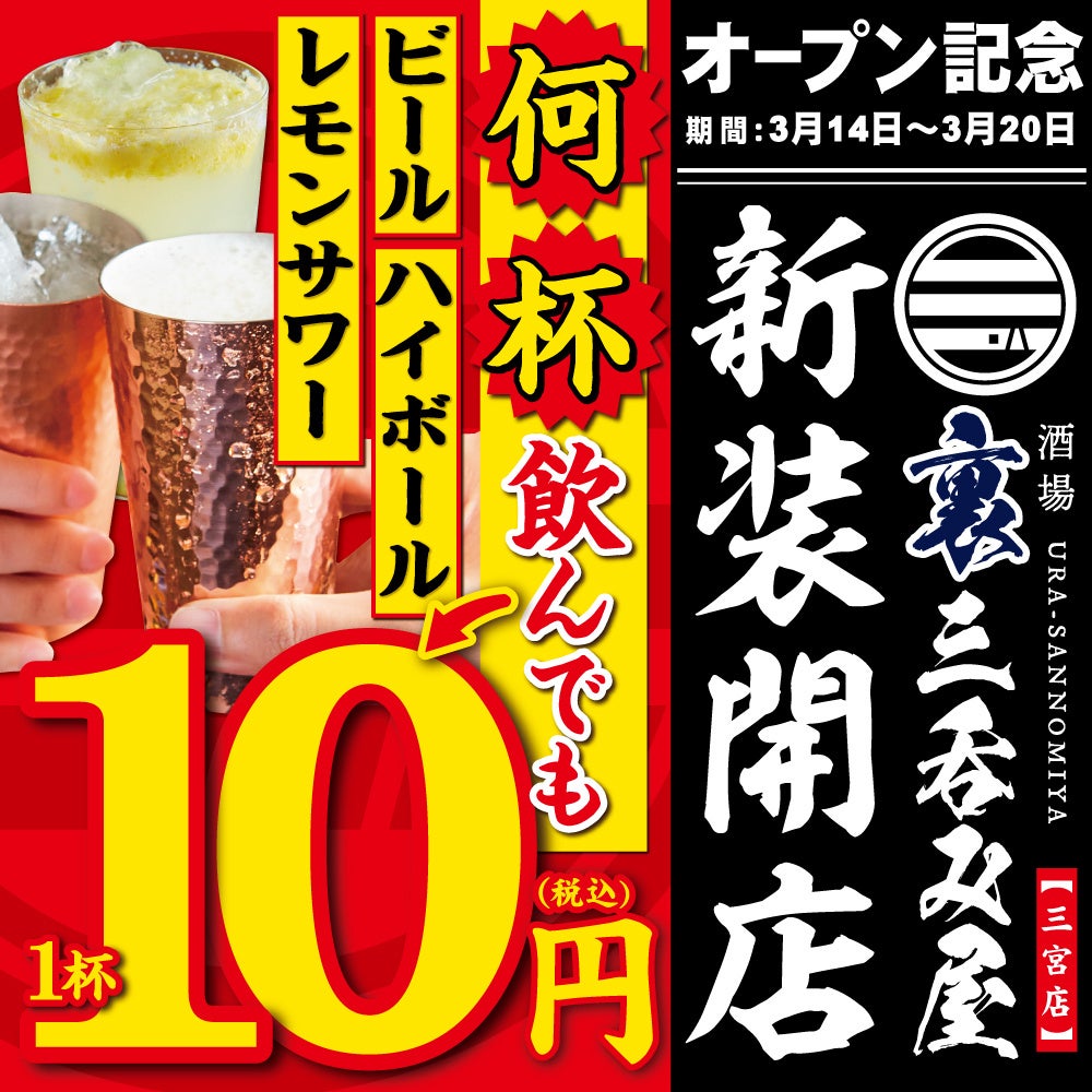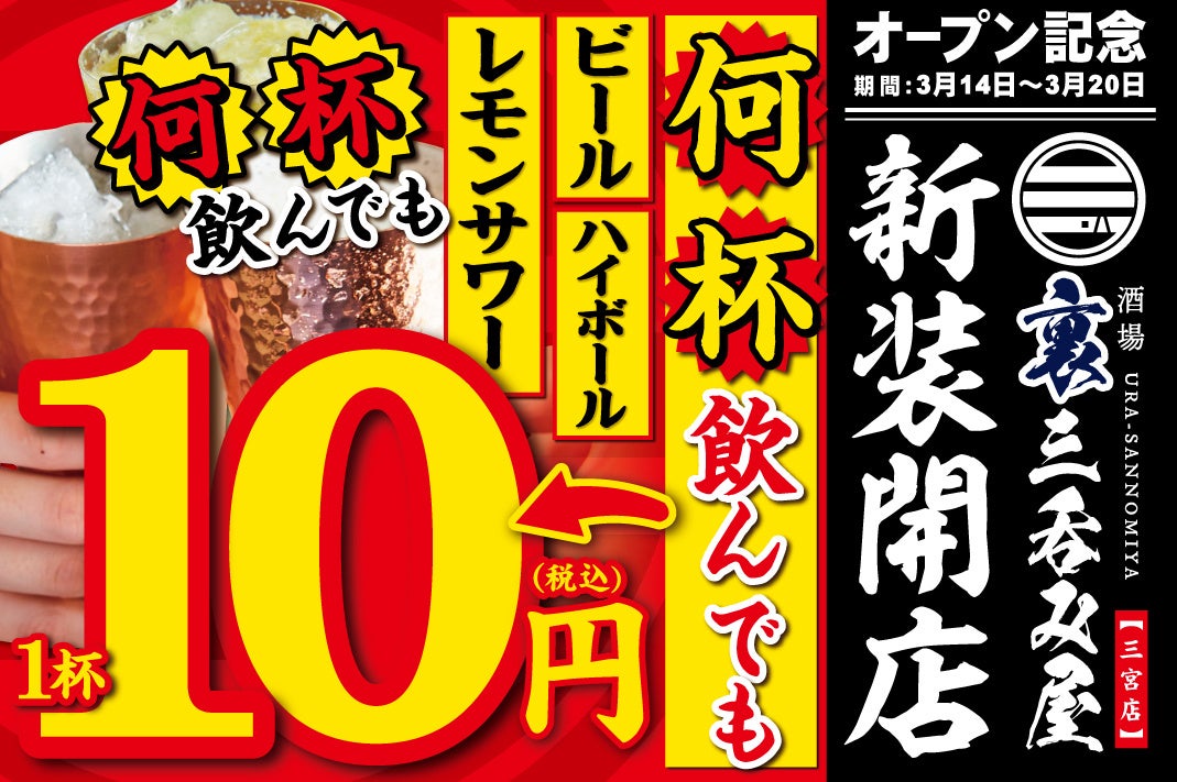 3号店「酒場 裏三呑み屋 三宮店」のグランドオープンを記念して、生ビール・ハイボール・レモンサワーが何杯飲んでも1杯10円となるキャンペーンを期間限定で実施いたします。