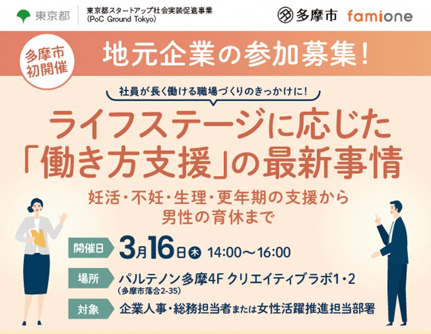 この度、東京都多摩市(市長:阿部 裕行)と共に、社員が長く働ける職場づくりのきっかけ作りとして多摩市企業を対象とした地元企業交流会「ライフステージに応じた “働き方支援”の最新事情~妊活・不妊・生理・更年期の支援から男性の育休まで~」を3月16日(木)に開催します。