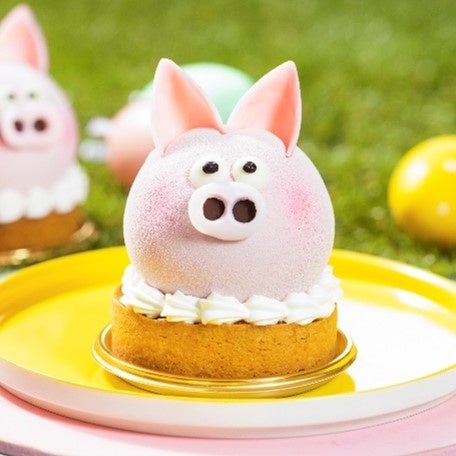 ピンクの頬がチャーミングなこぶたをモチーフにしたストロベリームースです。中に詰まったフロマージュブランムースとカシスクリームで、さっぱりとした味わいに仕上げました。幸せを運ぶとされるぶたの形をしたムースで素敵なひと時をどうぞ。