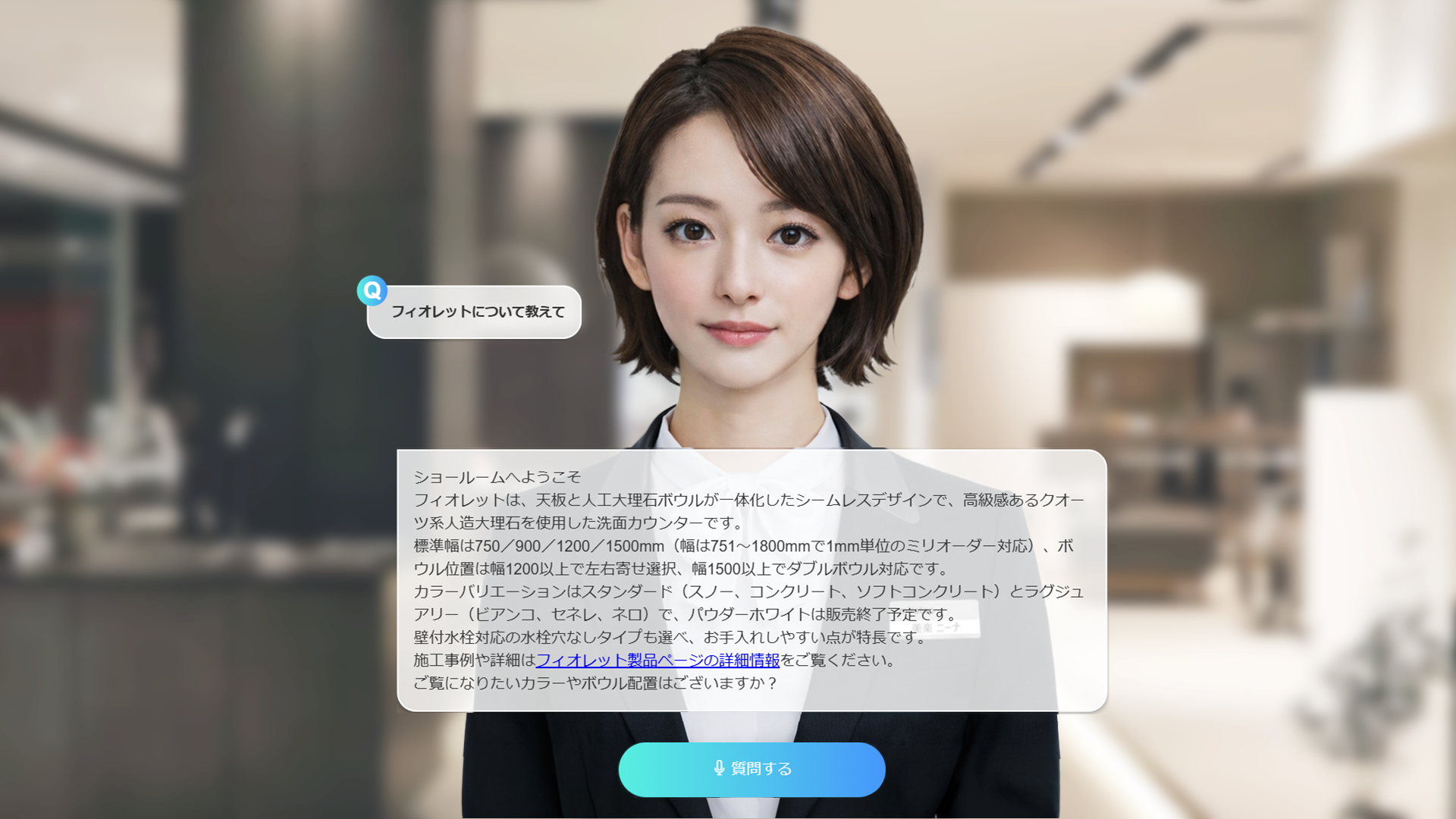 当社が初めて採用したAI社員「美楽 ニーナ(みら にーな)」が、来場者の接客を担当します。当社のECサイトに掲載する商品情報を学習しており、展示商品の仕様やカラーバリエーションなど、来場者の疑問にリアルタイムでお答えします。予約不要で常時対応が可能なため、混雑時でも待ち時間なくご相談いただけます。