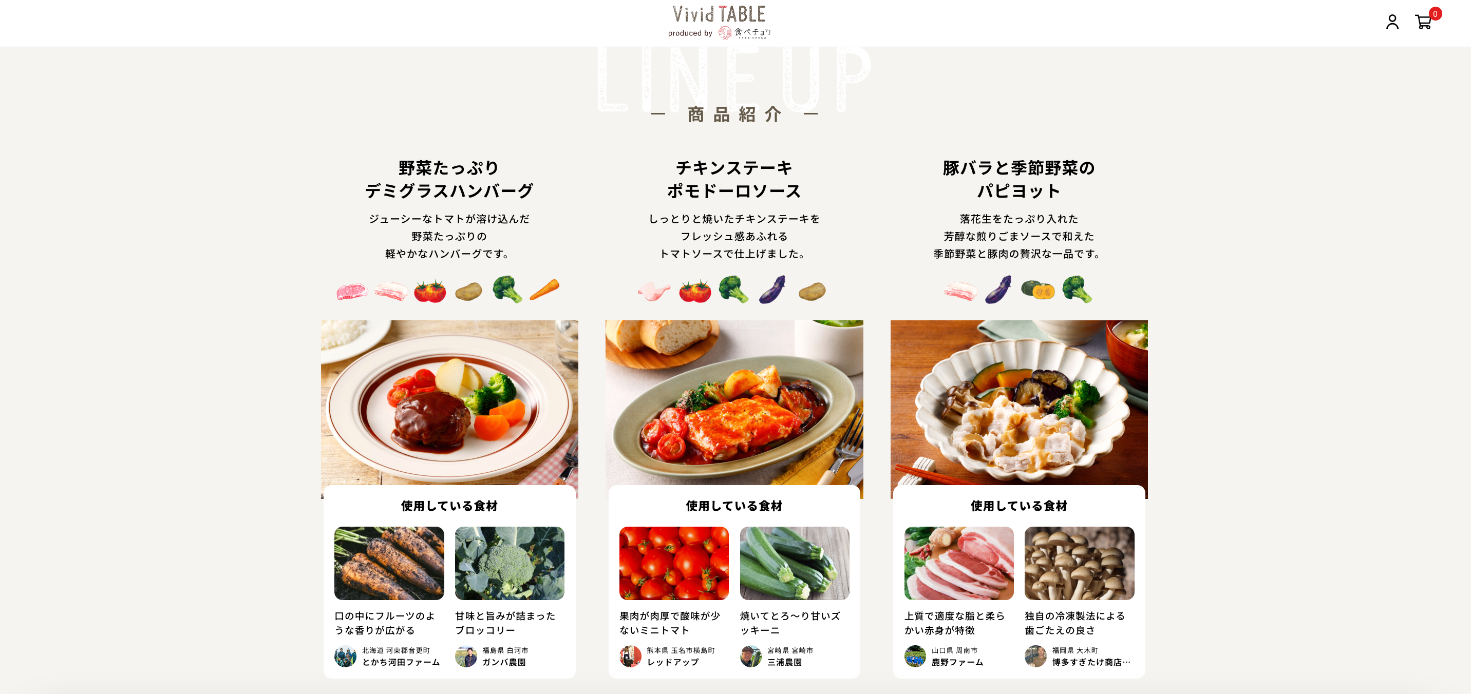 「Vivid TABLE」リリース時点ではオリジナルの3商品に加え、国内No1の産直EC「食べチョク」にて人気の冷凍商品なども合わせた、約10品の中から選んで、購入が可能です。