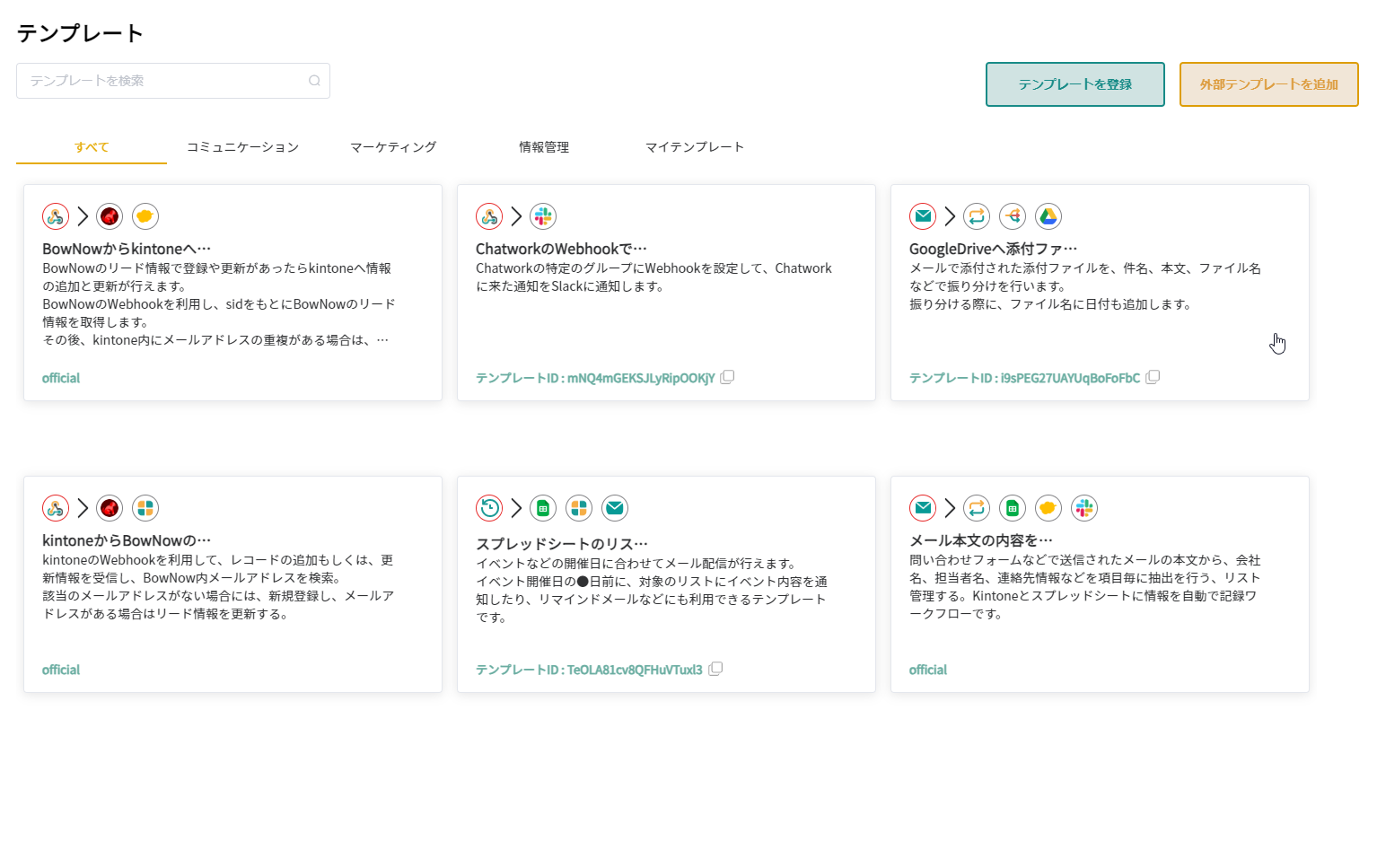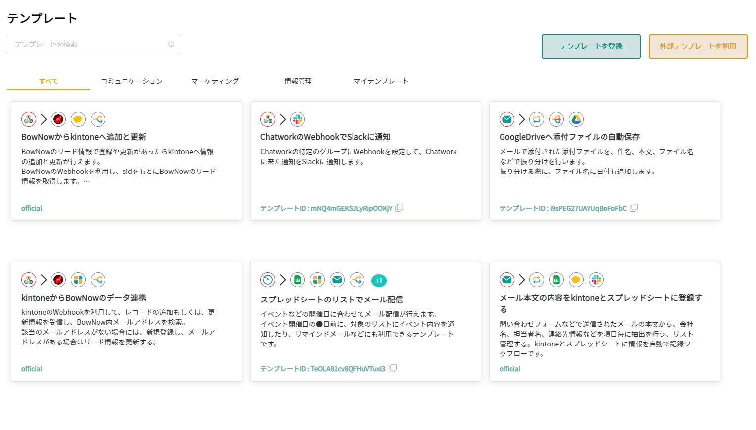 『テンプレート』機能の実装により、目的の業務に合わせたフローがテンプレート化しているので、初めてiPaaSを扱う方でも、より簡単に素早くJENKAを活用できます。また、作成したフローをテンプレート化し、共有することが可能です。