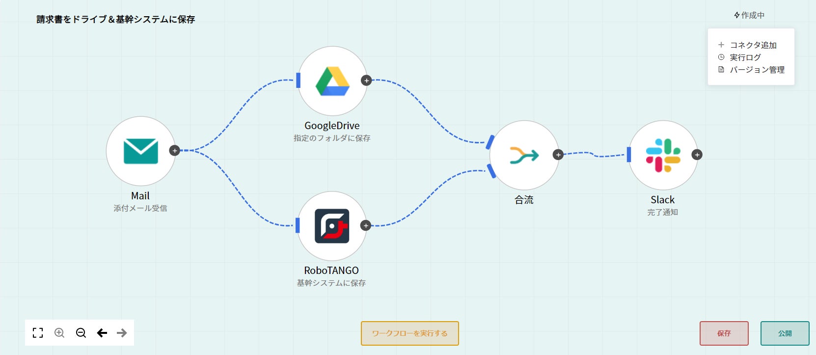 請求書が添付されたメールを受信後、GoogleDriveと同時に基幹システムに請求書データを自動保存。完了後、Slackに通知すればワークフローが完了したのかを簡単に確認できます。クラウドとローカルを区分けし同時にワークフローを動かすことが可能です。