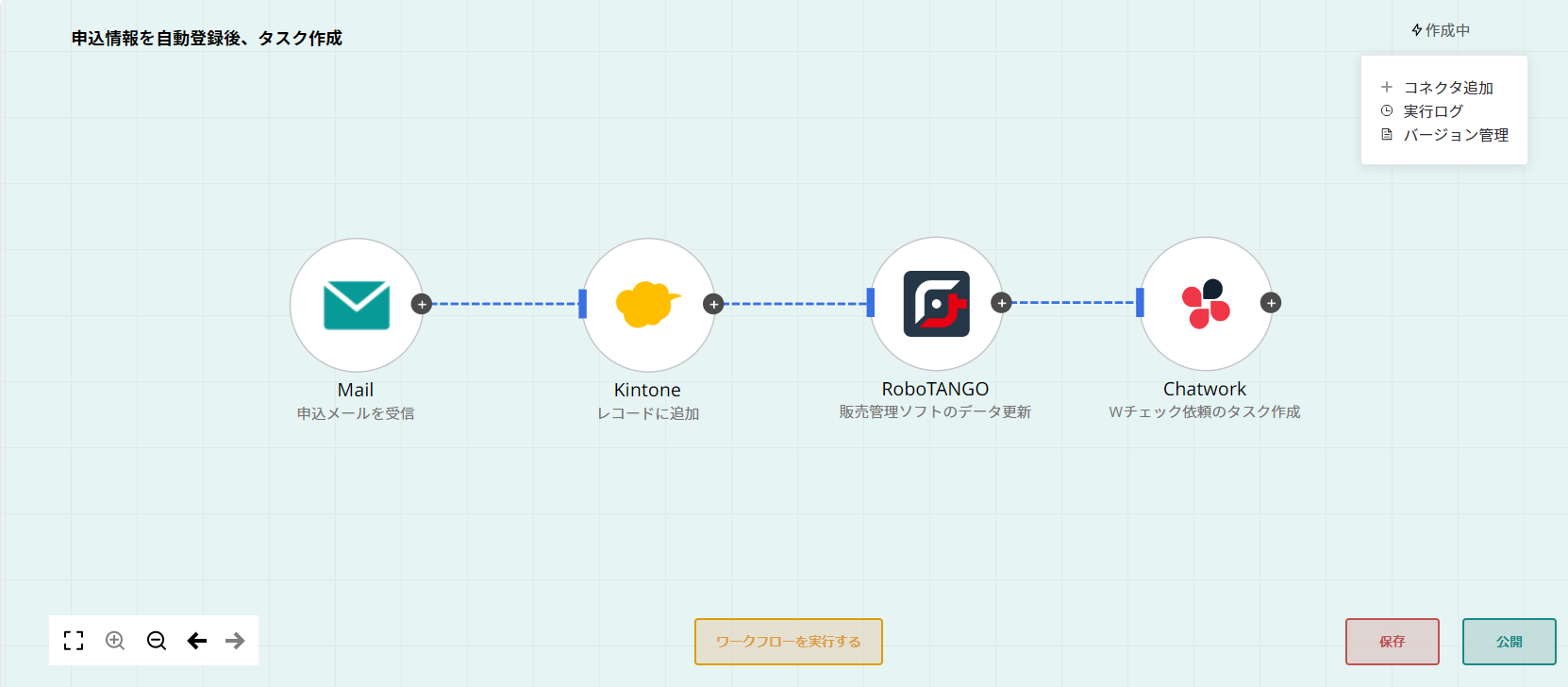 申込フォームからの申込内容をkintoneに情報を追加。それをトリガーにRoboTANGOが起動し、ローカル環境にある販売管理ソフトにデータを更新。クラウドシステムとローカルシステムへの登録の二度手間を省き効率化します。完了後にはChatworkで確認依頼のタスクを通知し確認漏れを防ぎます。
