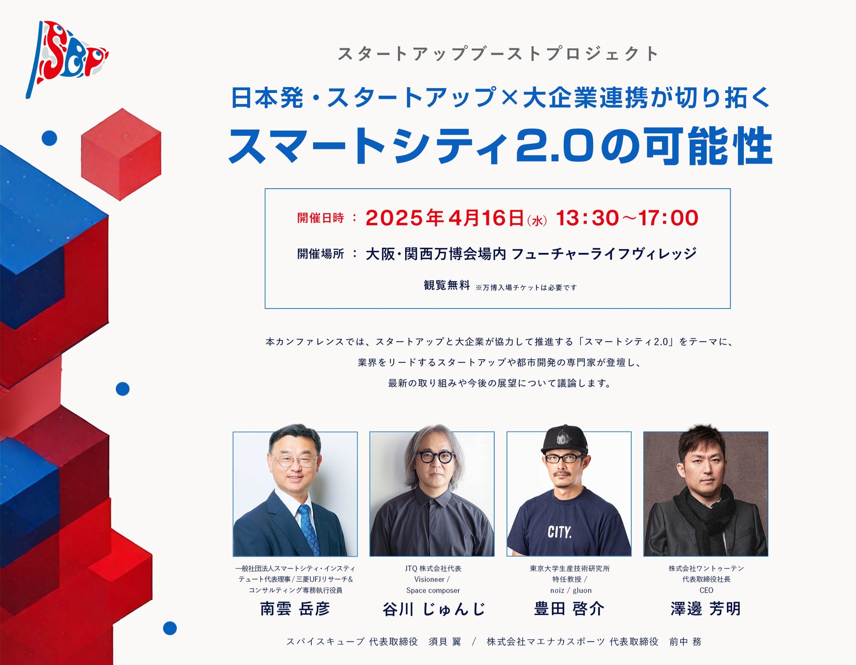 株式会社ワントゥーテン(本社:京都、代表取締役社長:澤邊芳明)は、公益社団法人2025年日本国際博覧会協会と共催で、2025年4月16日(水)、大阪・関西万博会場内フューチャーライフヴィレッジ(FLV)ステージにて、スタートアップブーストプロジェクト(SBP)「日本発・スタートアップ×大企業連携が切り拓くスマートシティ2.0の可能性」を開催します。