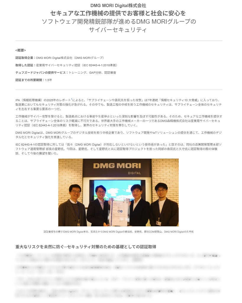 国際的な第三者認証機関であるテュフズード(本部:ドイツ・ミュンヘン)は、DMG MORI Digital株式会社(本社:北海道札幌市、DMG森精機グループ)が、産業用サイバーセキュリティ認証(IEC 62443-4-1:2018)を取得するにあたり、トレーニング、ギャップ分析、認証審査を通じて支援いたしました。この度、テュフズードの日本法人であるテュフズードジャパンにて、当該認証取得に関するDMG MORI Digital社の経験を事例として紹介するケーススタディを公開しました。