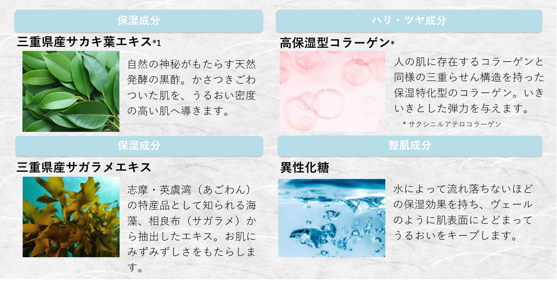 伊勢の地で育った榊の葉から抽出したサカキ葉エキスのほか、清らかでキメの整ったなめらかな手肌へ導く天然由来成分を配合しました。