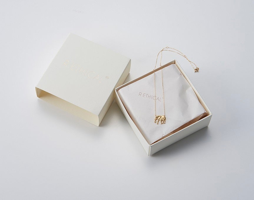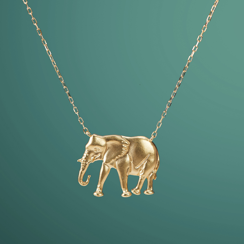 本ネックレスは、絶滅危惧種「アフリカゾウ」をモチーフにし、その雄大な歩く姿を繊細に表現しました。ホーニング加工(半つや消し加工)を施すことで野生のゾウのテクスチャーを模し、ゾウがもつ優しく品格のある美しい雰囲気のネックレスに仕立てました。チャーム部分はフェアマインド認証ゴールドを使用したK18ゴールドを使用しています。