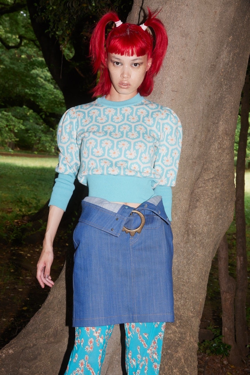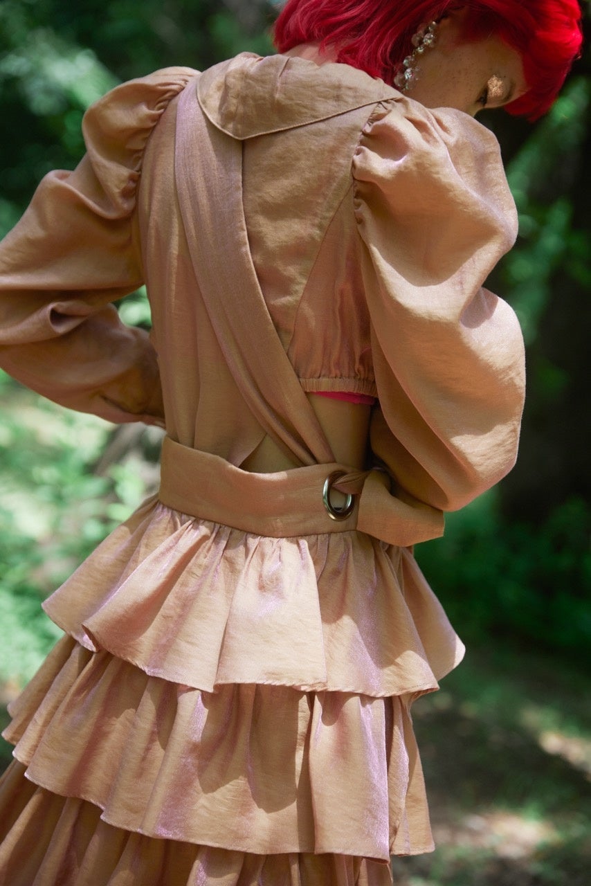 1シーズン⽬となる2022A/Wコレクションのテーマは『Floating & Melting』。⼤胆なギャザーやフリル使いが特徴的なアイテムや、オリジナルプリントのパワーネットやキャミワンピースなど、70’sやメローなイメージを想像させつつも、ハッピーでエネルギッシュなスタイルを提案します。