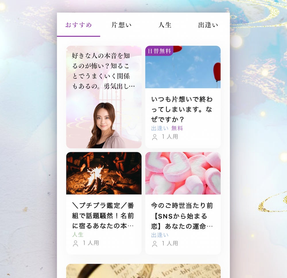 全員が楽しめる無料コンテンツのほかに、それぞれの悩みに添った特別なコンテンツをご用意しています。いま、あなたに必要な鑑定が見つかるはず。