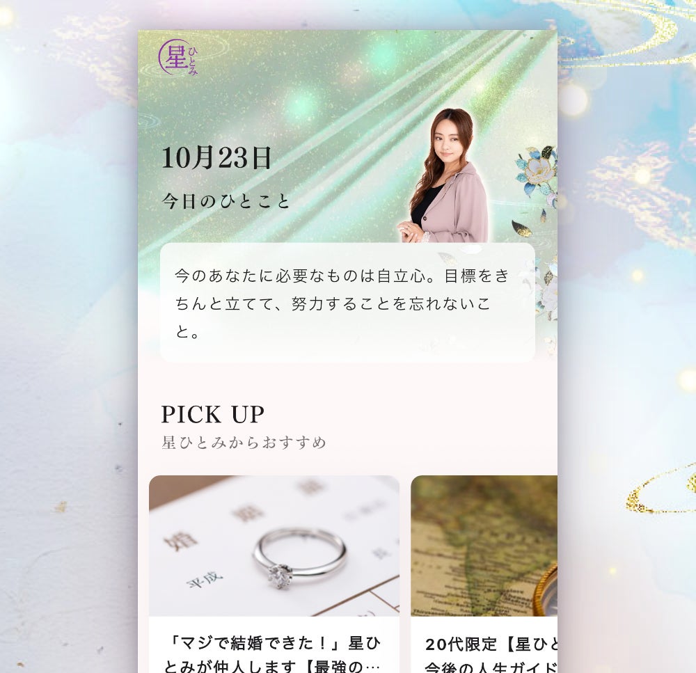 この度新たにリリースしたアプリは、テレビ「突然ですが占ってもいいですか?(フジテレビ系)」で芸能人の未来を的中させ、業界にも多くのファンを持つことで有名な占い師・星ひとみさんが監修をする公式アプリです。