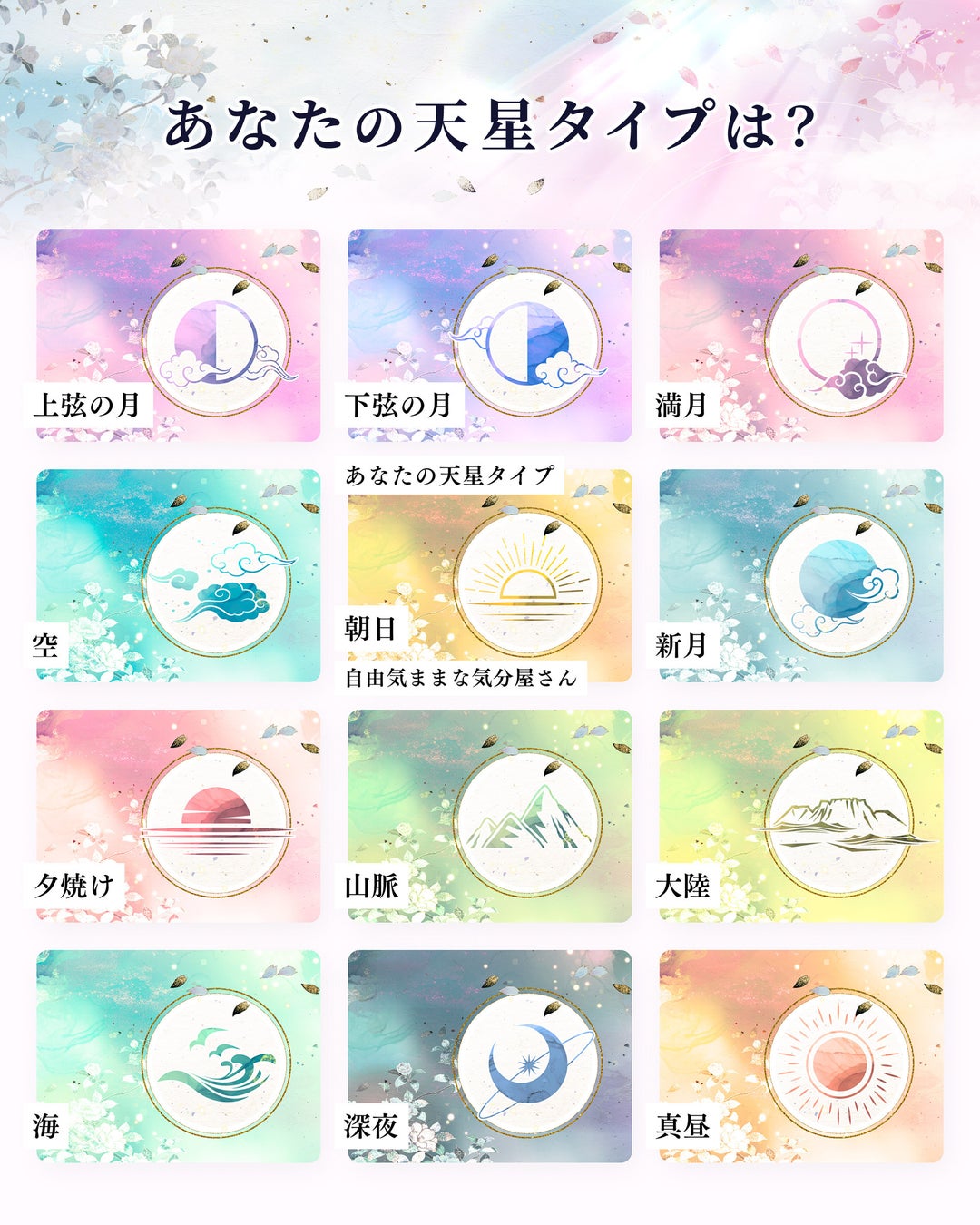 生年月日のエネルギーから、12の天星タイプ別に本質や運気の流れを鑑定。基本性格、恋愛傾向や仕事傾向がわかります。