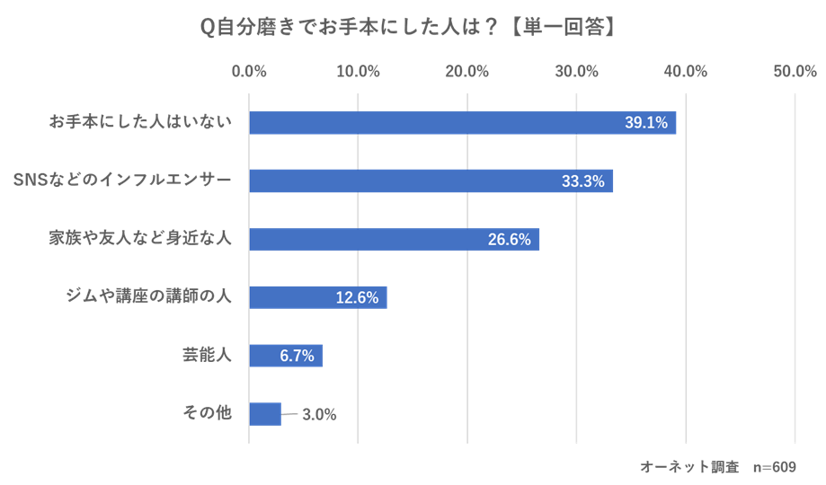 もっとも多いのは「お手本にした人はいない」という回答で39.1%。次いで「SNSなどのインフルエンサー」が33.3%、「家族や友人など身近な人」が26.6%という結果に。誰かをお手本にする場合には、SNSで見かけたり、直接会ったりと、目にする機会が多い人をお手本にしているようです 。