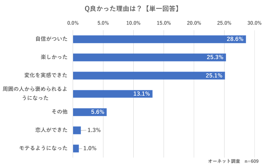 自分磨きをして良かった理由でもっとも多かったのは「自信がついたから」で28.6%。次いで「楽しかった」が25.3%、「変化を実感できた」が25.1%という結果となりました。