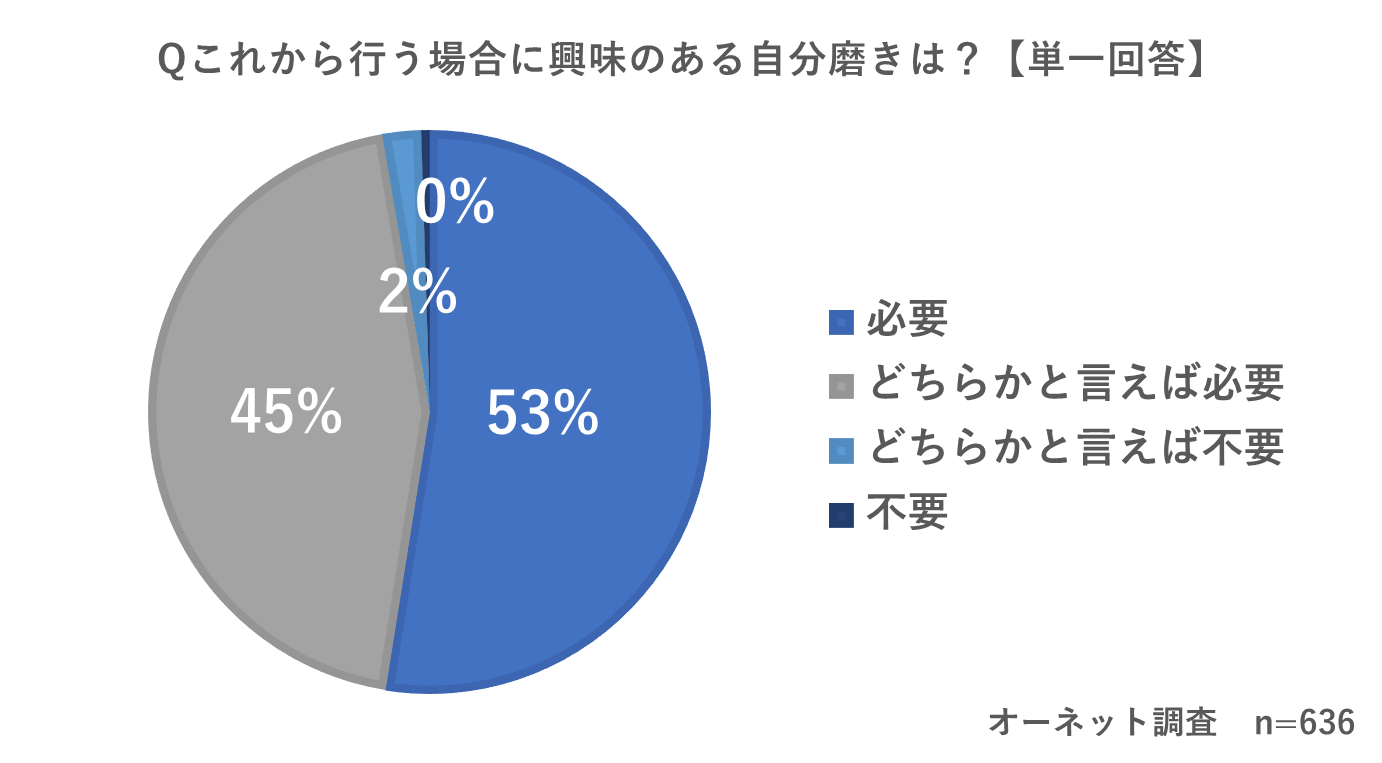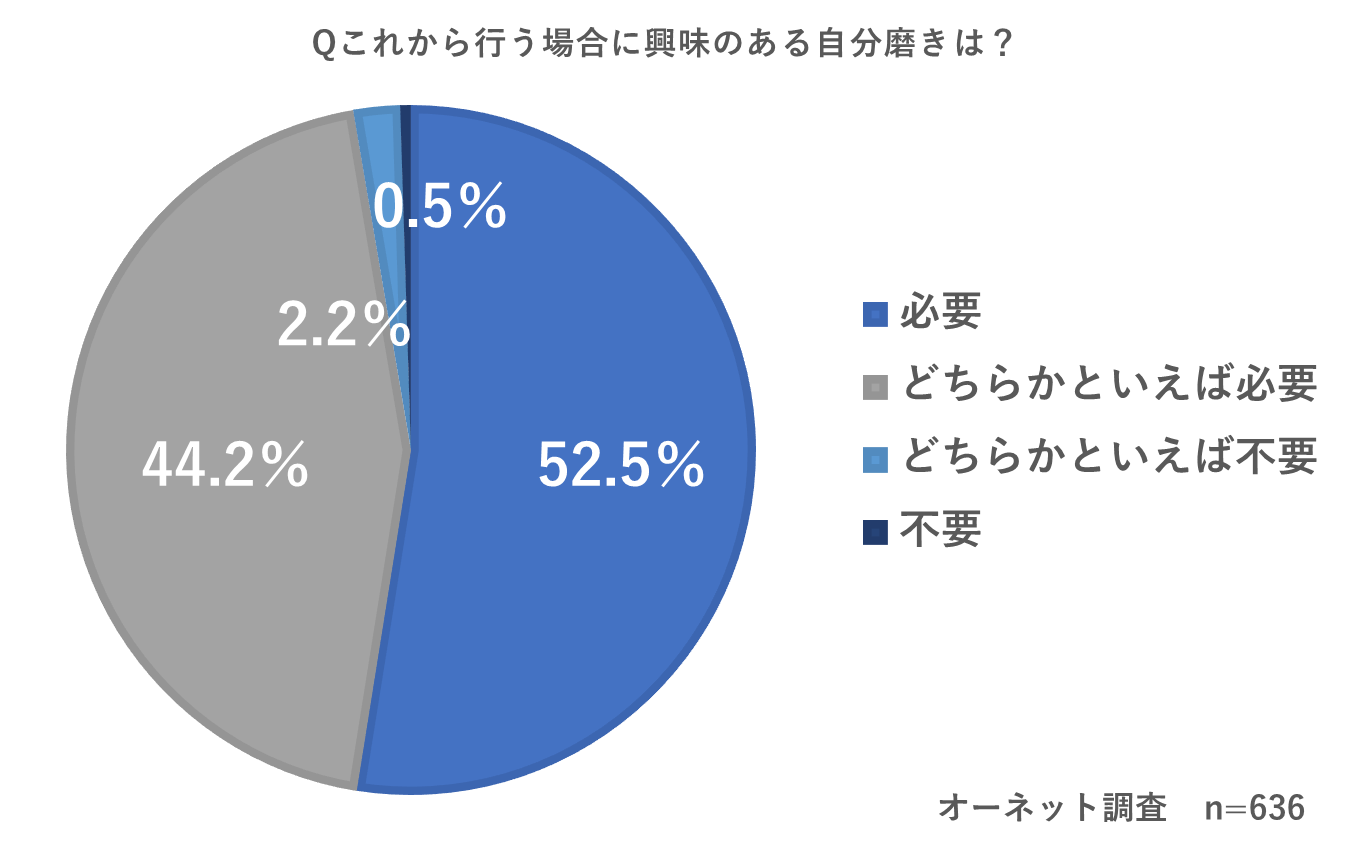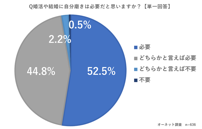 婚活に自分磨きが「必要」と回答した人が52.5%、「どちらかといえば必要」と回答した人が44.8%で9割以上が必要だと感じていることが分かりました。一方、「どちらかといえば不要」と回答した人は2.2%「不要」と回答した人は0.5%となりました。