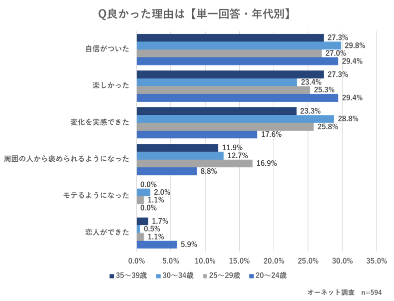 一方で「恋人ができた」「モテるようになった」という理由は少なく、異性からの評価よりも内面の変化によって自分に自信が持てるようになったと感じている人が多いようです。