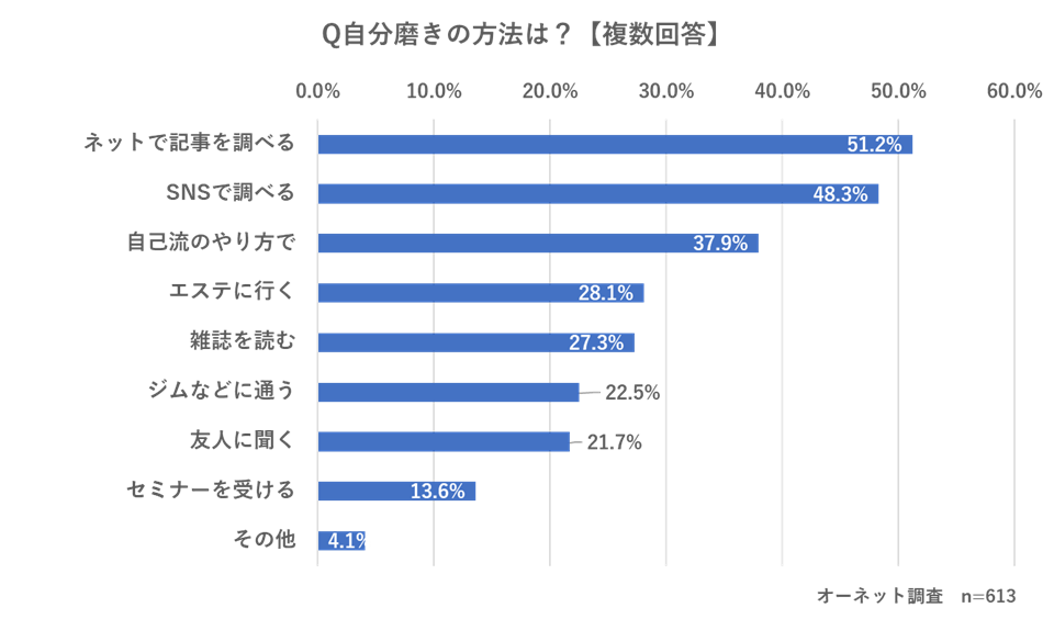 自分磨きの方法については、「ネットで記事を調べる」が51.2%でもっとも票を集めました。僅差で2位となった「SNSで調べる」は48.3%、次いで「自己流のやり方で」が37.9%。ネットで調べつつ、自己流の方法で自分磨きに取り組んでいることが分かりました。