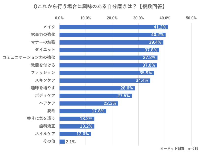 【9】興味のある自分磨きは「メイク」他、「家事力を磨く」など内面を磨く取り組みへの関心も高い