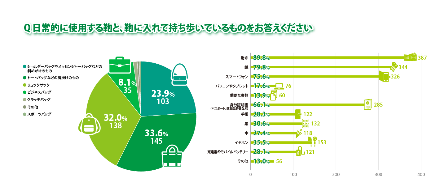 そんな鞄の中に入れて持ち歩いているものは「財布」89.8%、「鍵」79..8%、「スマートフォン」75.6%、「免許証などの身分証明書」66.1%で、貴重品が上位を占めています。