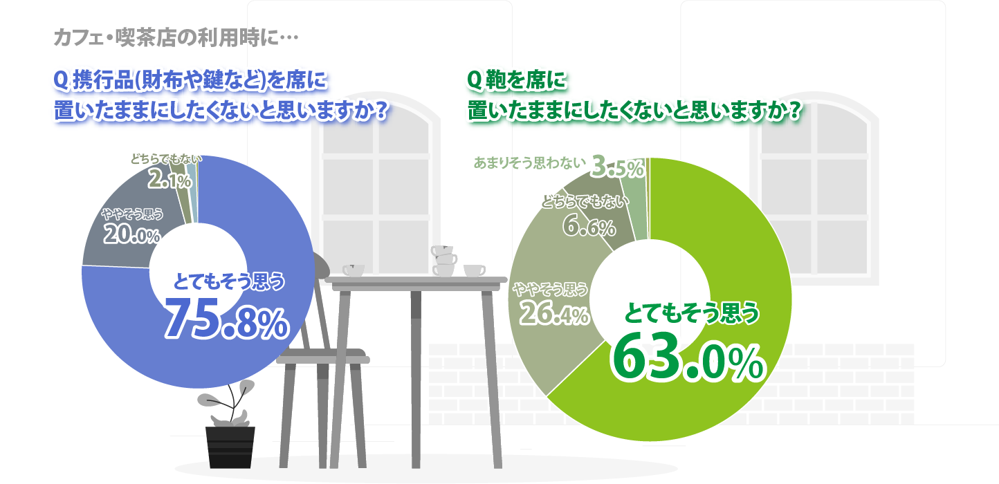 カフェや喫茶店を利用した際にトイレなどに立つ場合、紛失を心配して「携行品(財布や鍵など)を席に置いたままにしたくないと強く思う」人は75.8%でした。