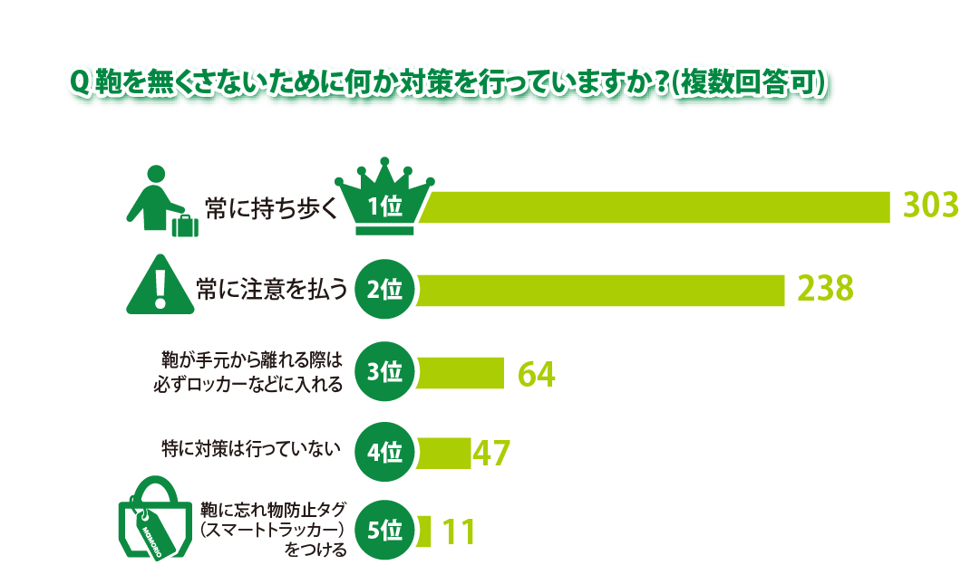 続いて「鞄が手元から離れる際は必ずロッカーなどに入れる」64人(14.8%)、「特に対策は行っていない」47人(10.9%)、「鞄に忘れ物防止タグ(スマートトラッカー)やGPSデバイスを取り付ける」11人(2.6%)の順でした。