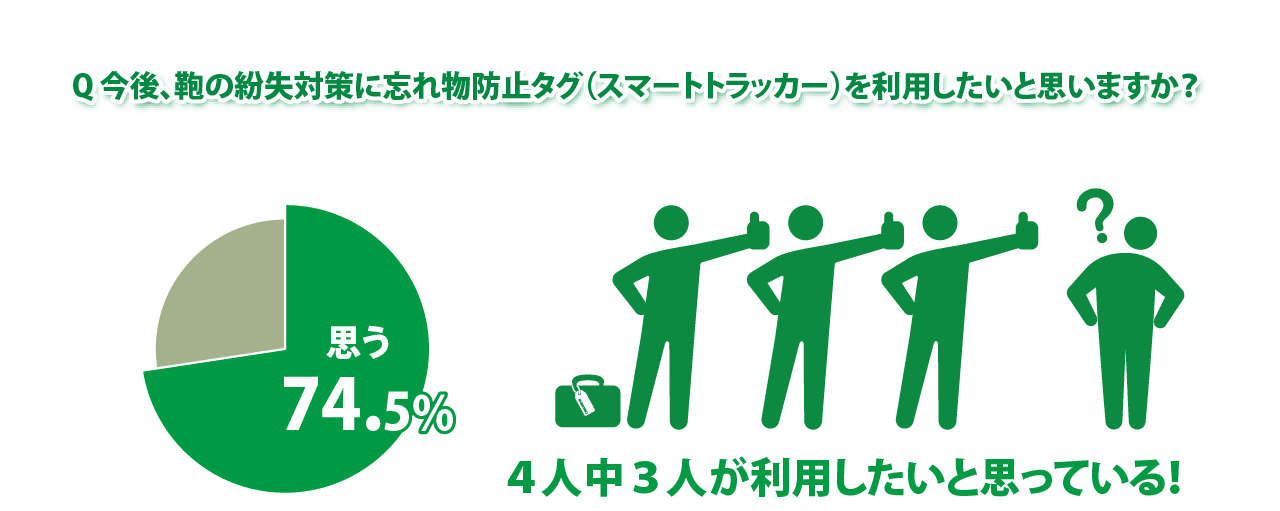 そこで、今後の鞄の紛失対策に「忘れ物防止タグ(スマートトラッカー)を利用したいと思いますか」という設問をしたところ、74.5%の人が「思う」と答えています。