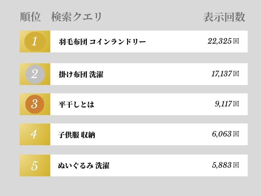 検索クエリを見ると、「羽毛布団 コインランドリー(22,325回)」「掛け布団 洗濯(17,137回)」「平干しとは(9,117回)」「ぬいぐるみ 洗濯(5,883回)」など、“家で洗っていいのか迷う洗濯物”に関する検索が多く寄せられています。
