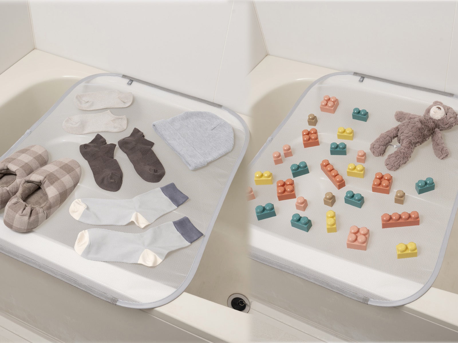 浴槽の上に置くだけで使えるため、水滴を気にせず干せて、洗ったぬいぐるみや小物類の乾燥にも便利です。